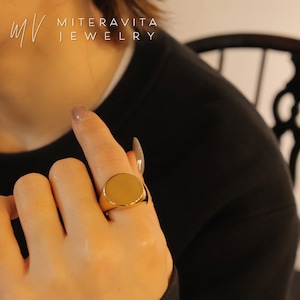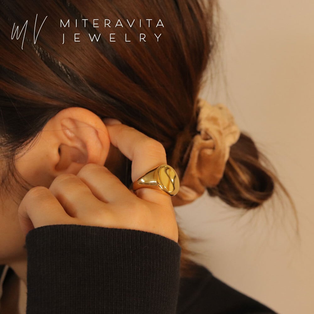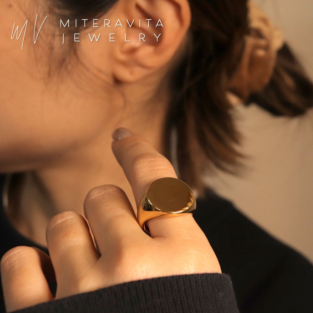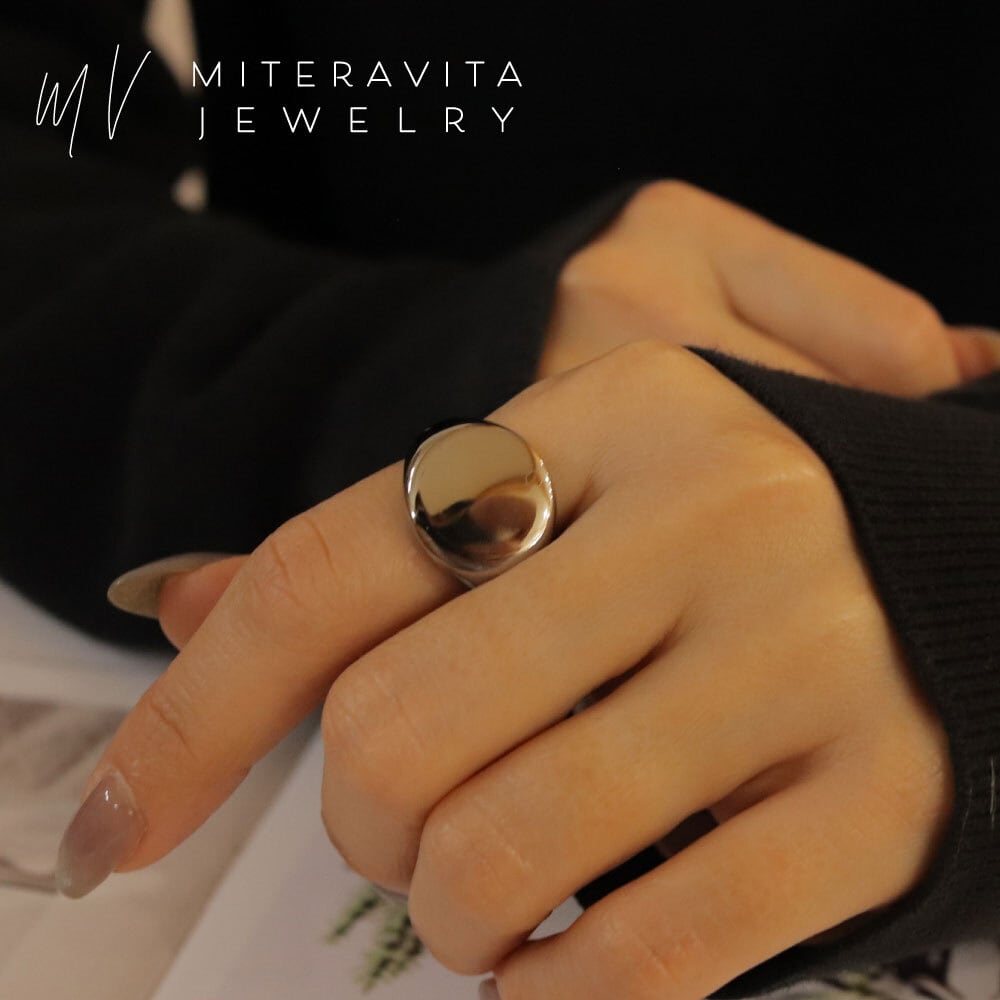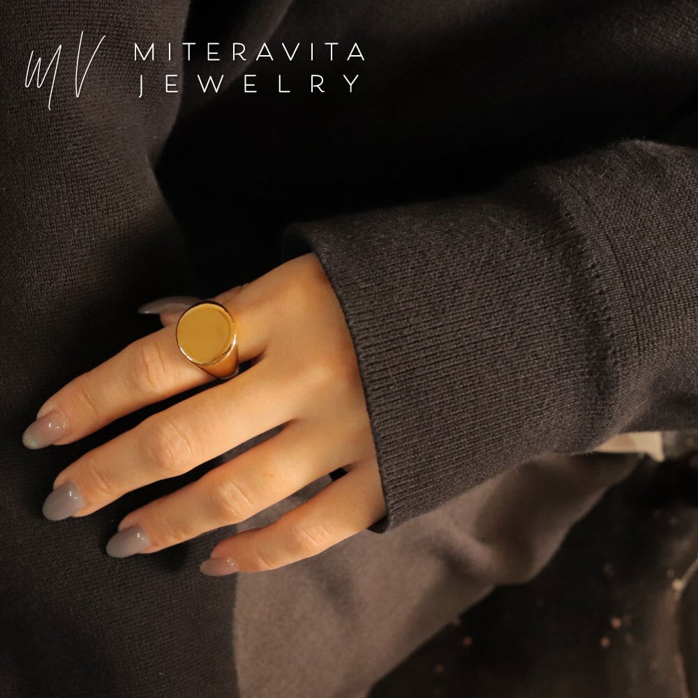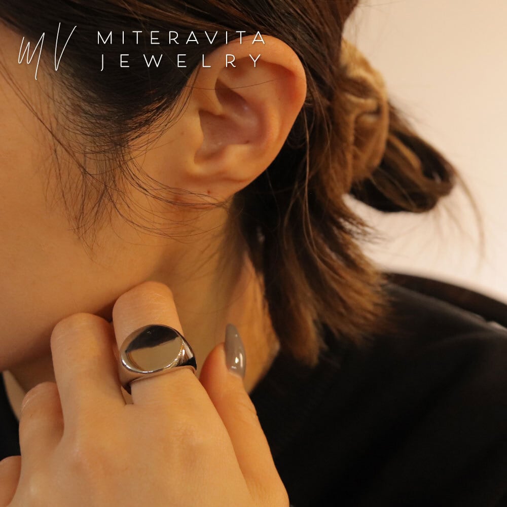フラットトップのシグネットデザインに、鏡面仕上げを施したリング。