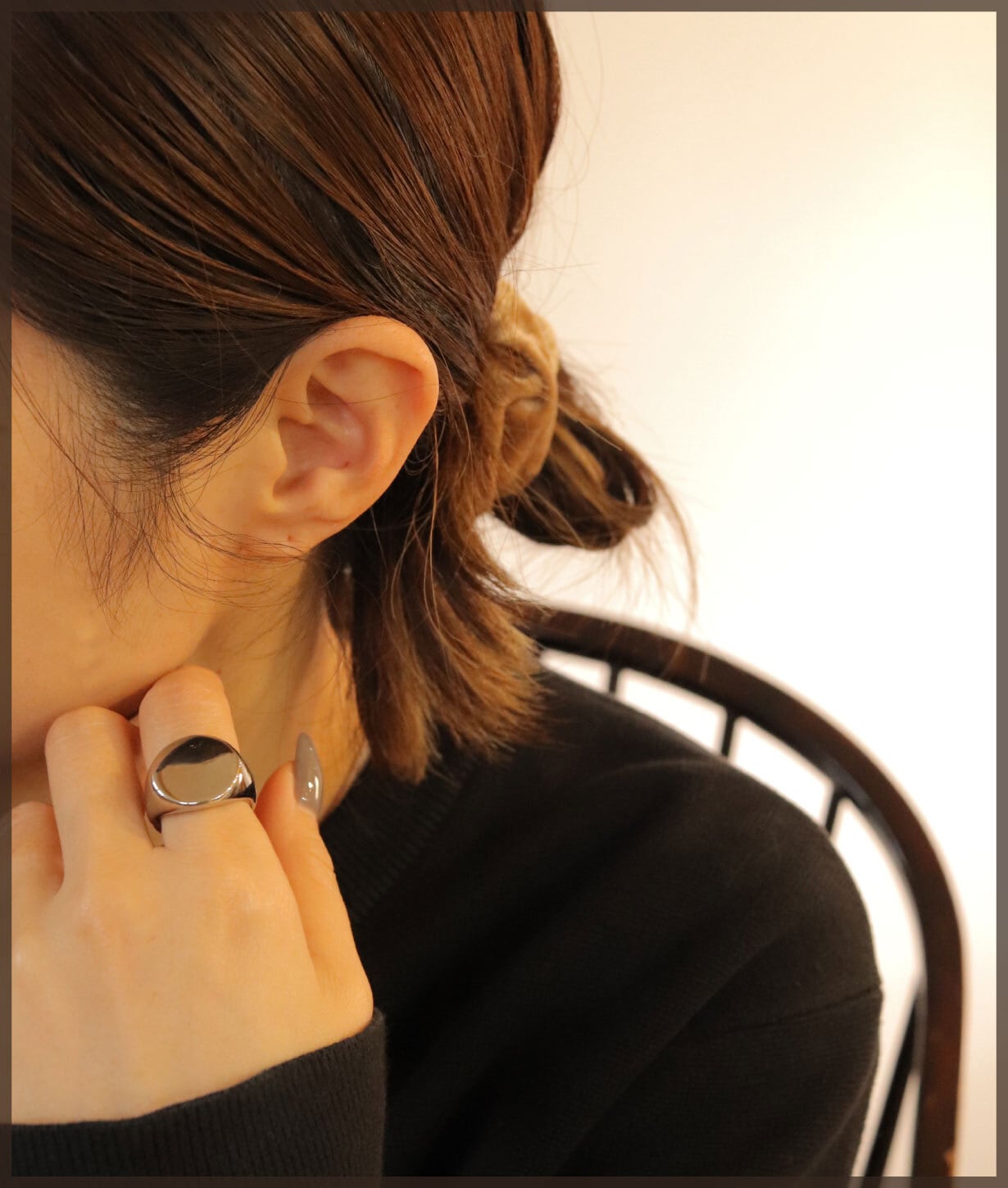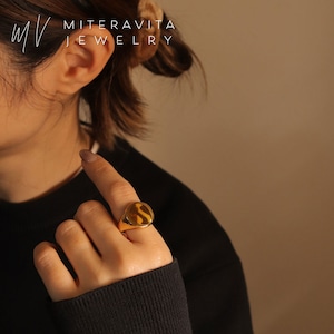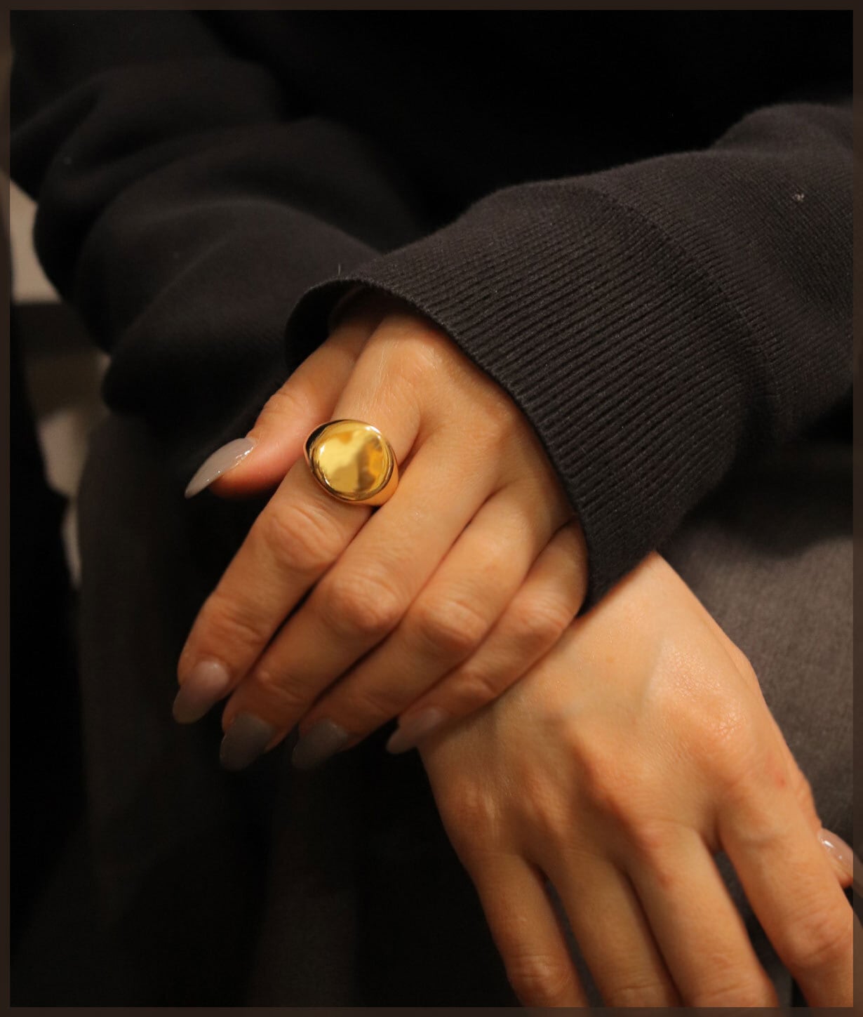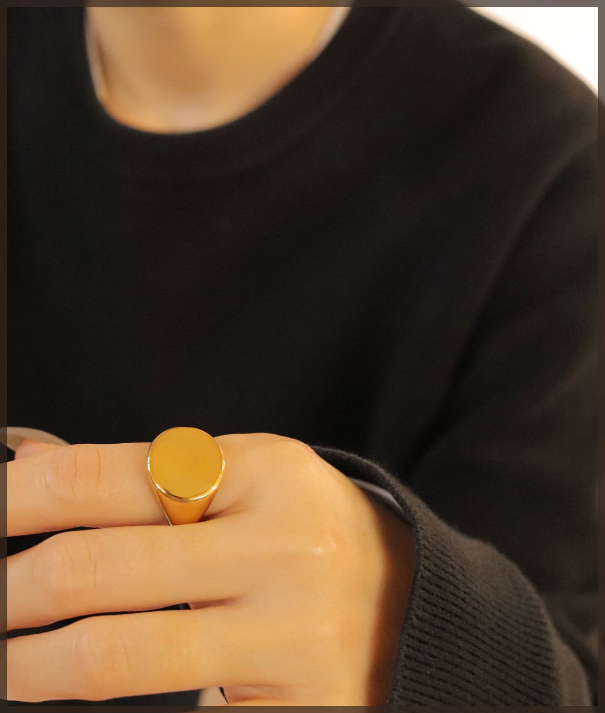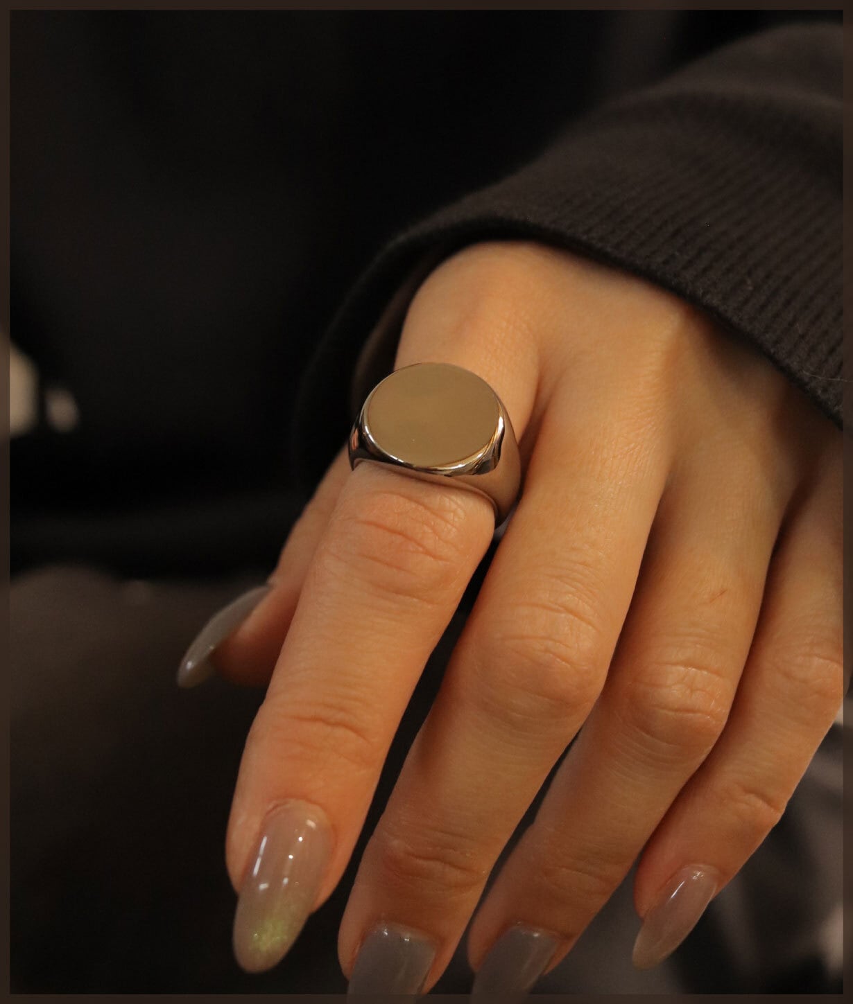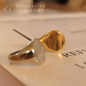 フラットトップのシグネットデザインに、鏡面仕上げを施したリング。