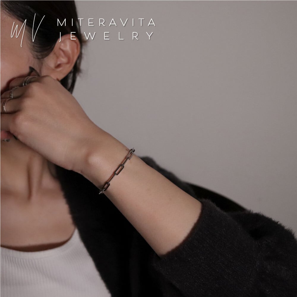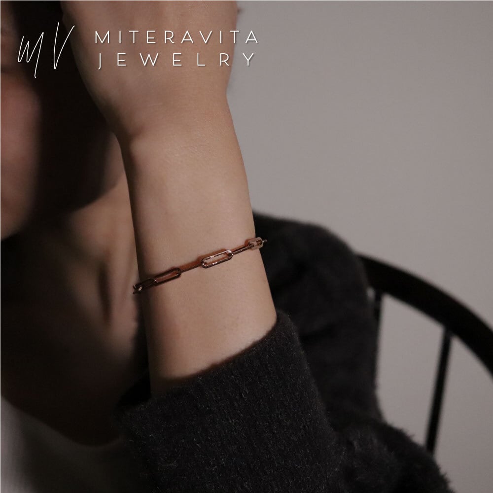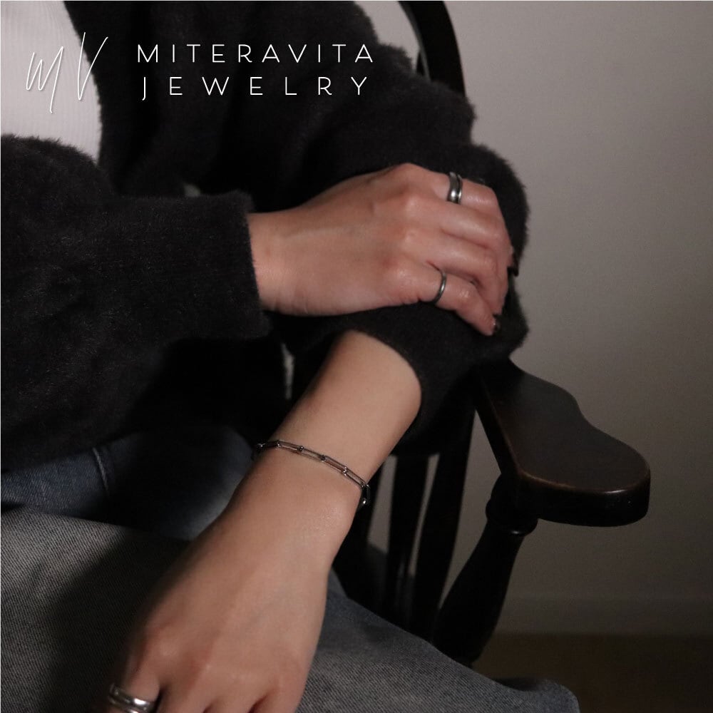 チェーン幅が大きめのフラットリンクチェーンブレスレット。チェーン幅にカニカンフックを留めてサイズ調整することも可能です。