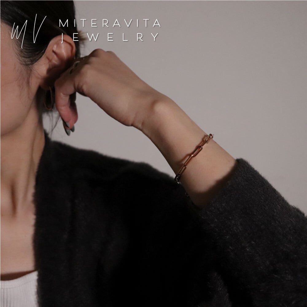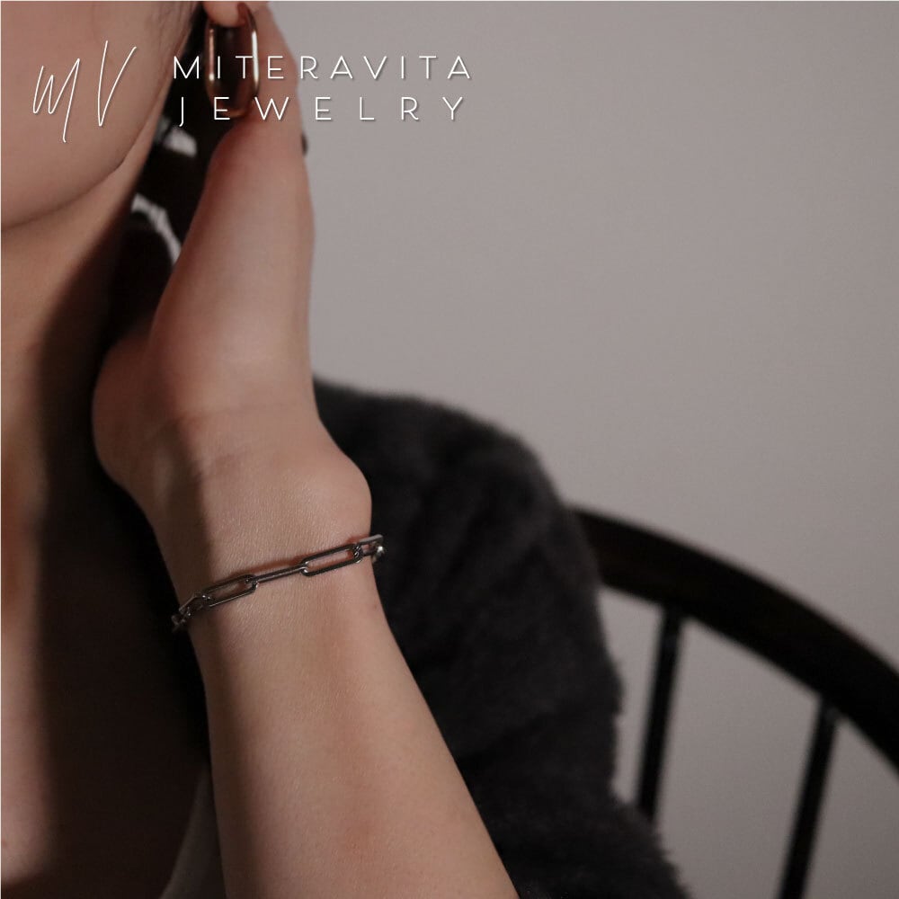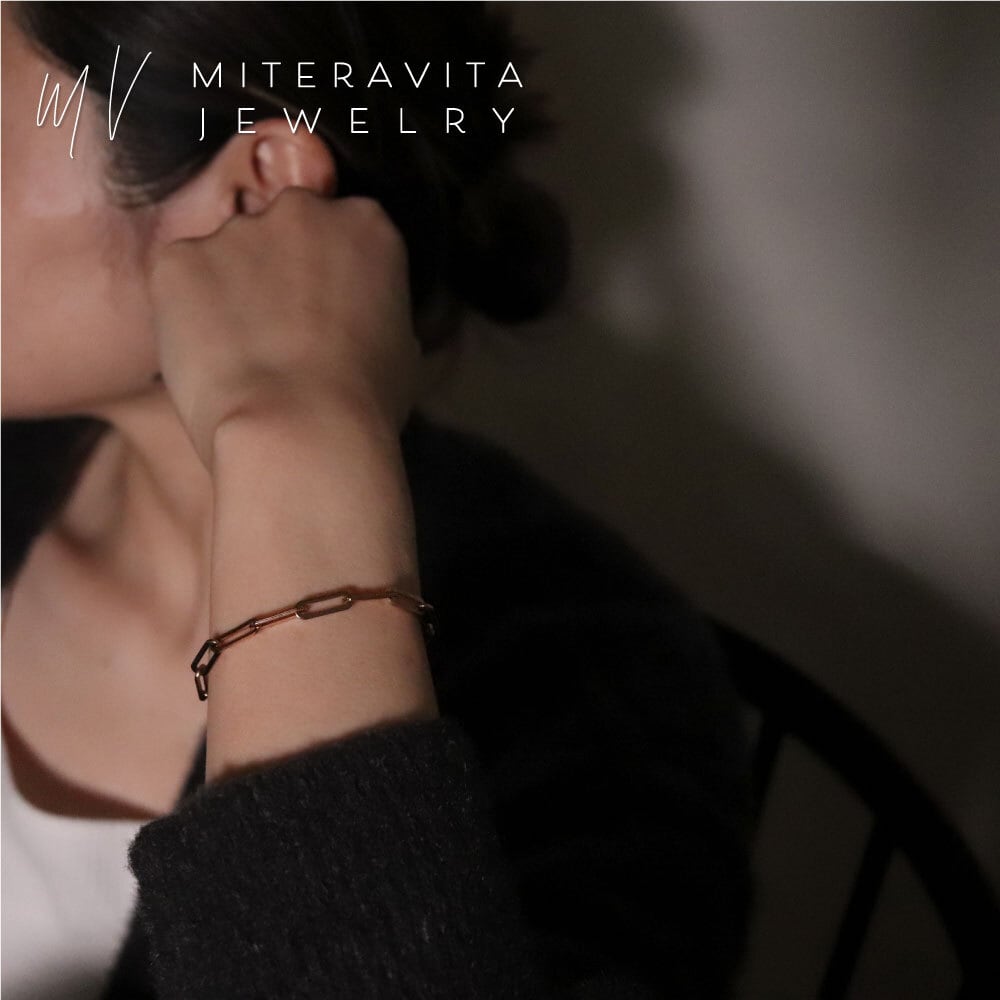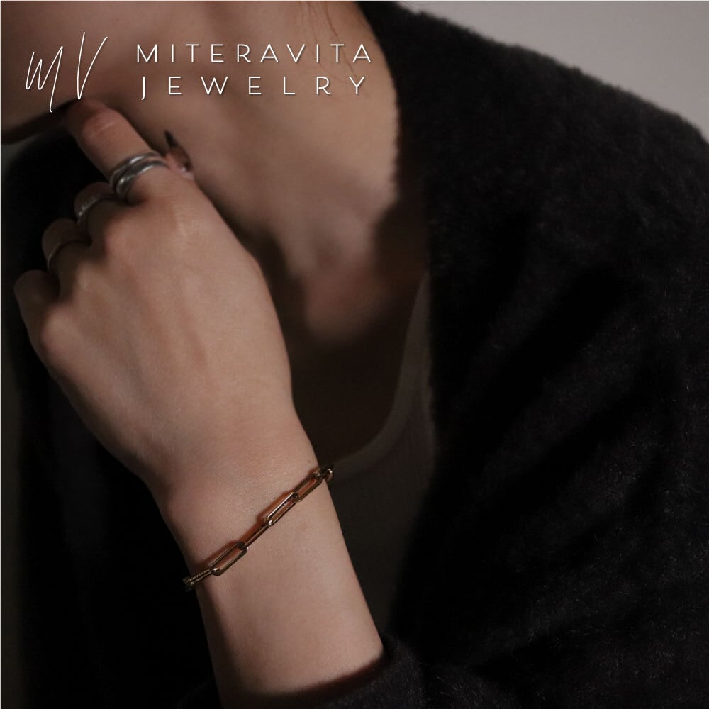 チェーン幅が大きめのフラットリンクチェーンブレスレット。チェーン幅にカニカンフックを留めてサイズ調整することも可能です。